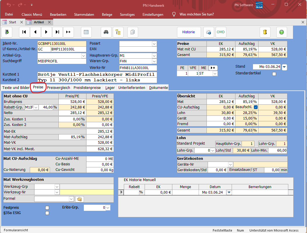 Klicken Sie im Artikel-Formular auf die Registerkarte "Preise", um die Preisübersicht des Artikels zu öffnen.