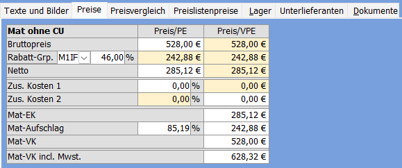 Im Feld "Mat-VK incl. MwSt." wird Ihnen der kalkulierte VK inklusive der aktuell gültigen Mehrwertsteuer angezeigt.