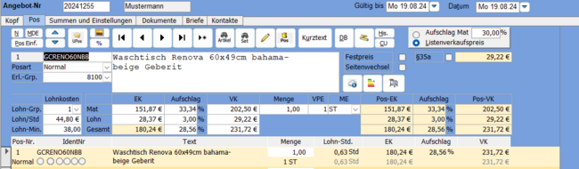 Klicken Sie im Angebot auf die Registerkarte "Pos", um die Positionserfassung zu öffnen.
