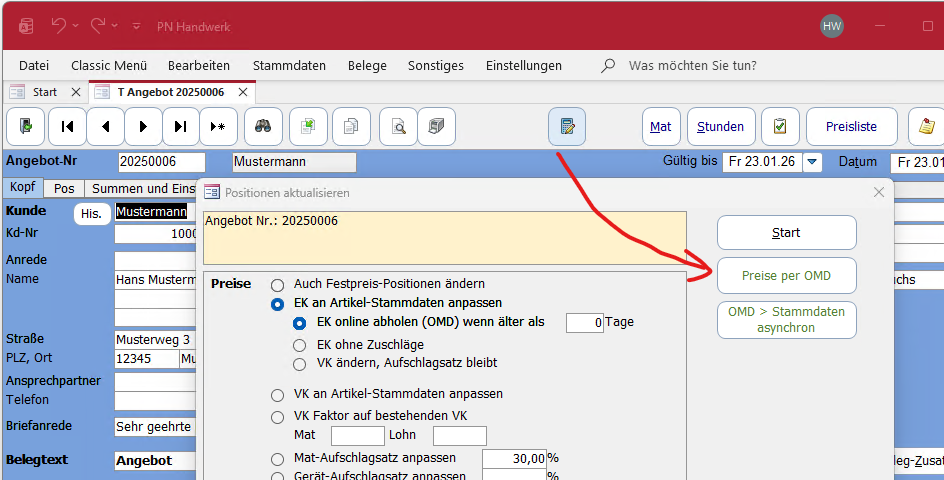 Hierbei spart man sich 2 Klicks. Das Programm weiß, dass die Preise bereits über OMD abgerufen wurden und führt nur die Aktualisierung im Beleg aus.
