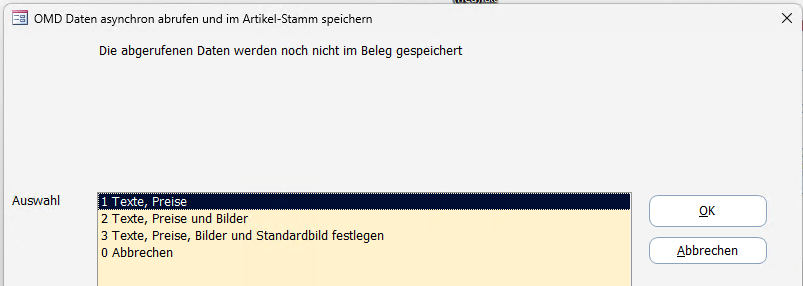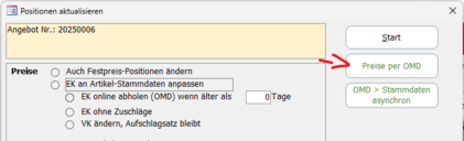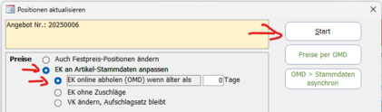 Beim Bestätigen einer der OMD-Schaltflächen werden die Optionen "EK an Artikel-Stammdaten anpassen" und "EK online abholen" automatisch gesetzt.