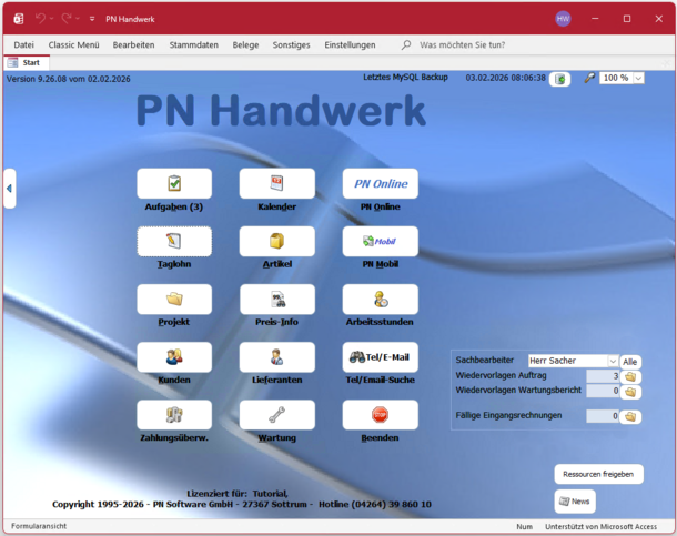 Nach dem Start von PN Handwerk wird als erstes das Startformular angezeigt.